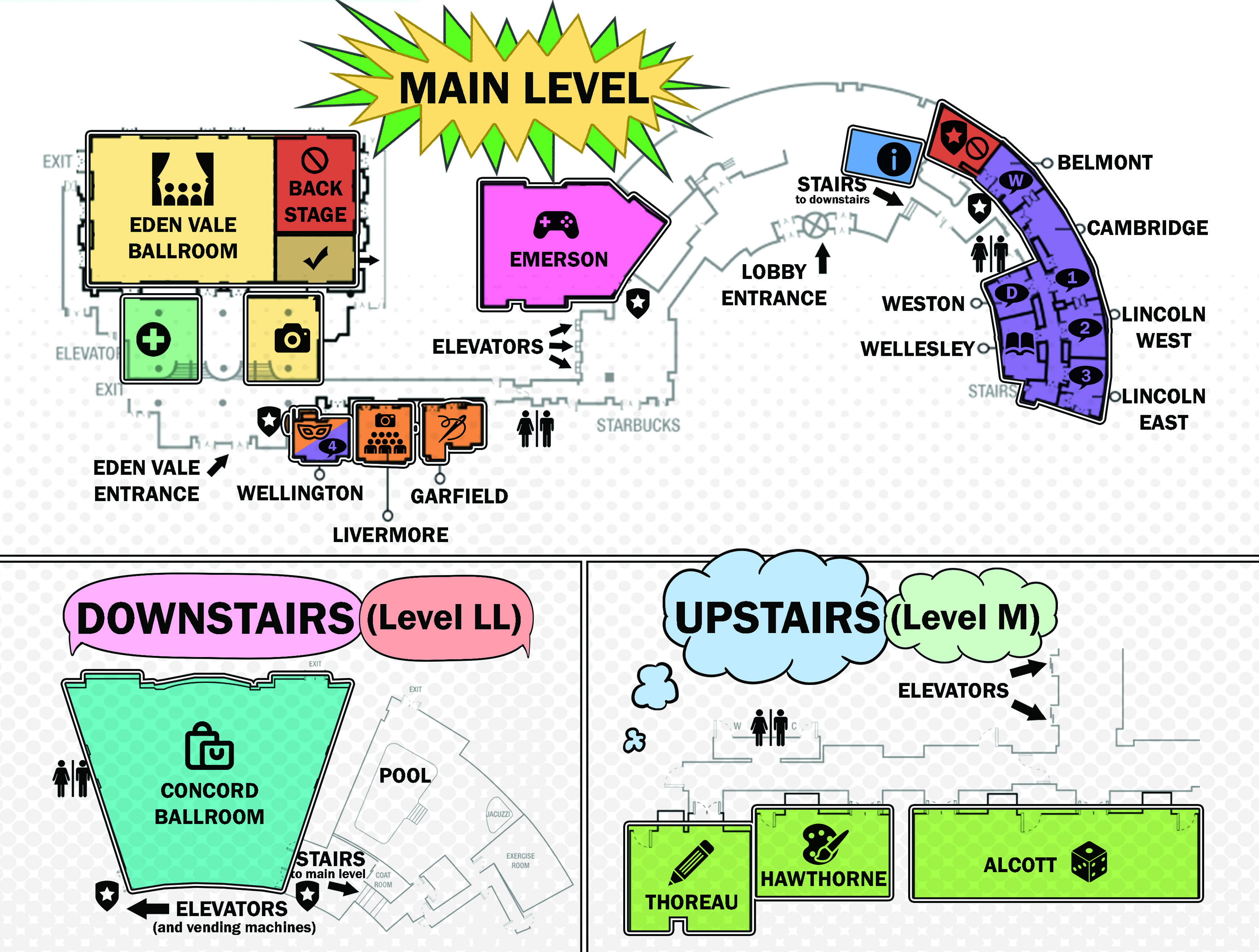 We’ve moved a few things around this year, most notably in the Cosplay Corridor (Wellington/Livermore/Garfield.) Masquerade HQ has been moved from Garfield to Wellington and will also be used as a panel room on Sunday. Meanwhile Garfield will be home to our newly refurbished Cosplay Repair! Last year, Livermore became our Cosplay Gatherings photo room and that is still true for this year – now with even more scheduled meetups!